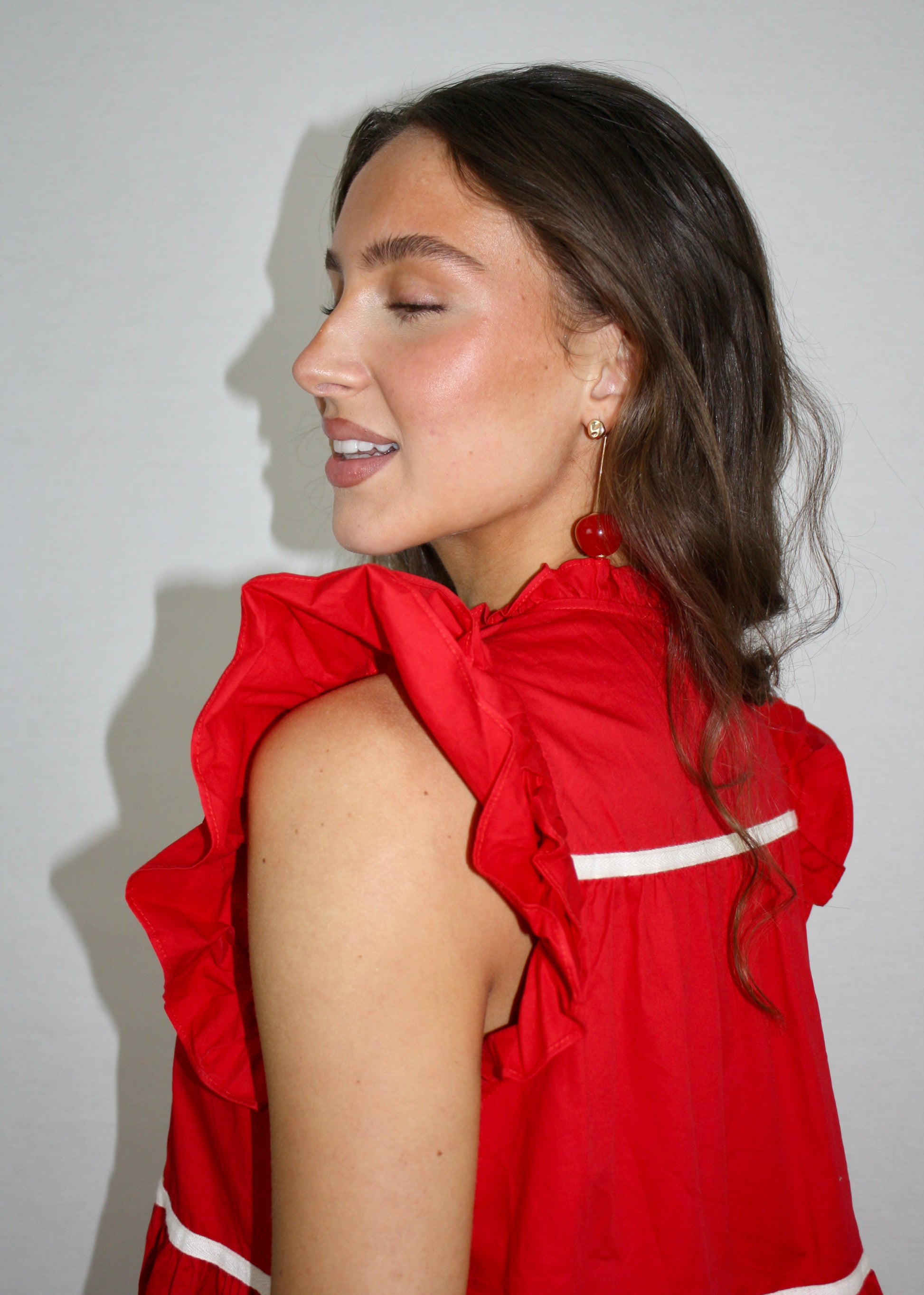 The Cherry Charm Dress is the perfect mix of cute, cool, and effortlessly chic. This bold red babydoll dress, made from 100% cotton, is lightweight and breathable for all-day wear. With ruffle details and contrast piping, it’s the ultimate statement piece—perfect for hitting brunch, getting dressed for gameday, or heading out for a fun night,